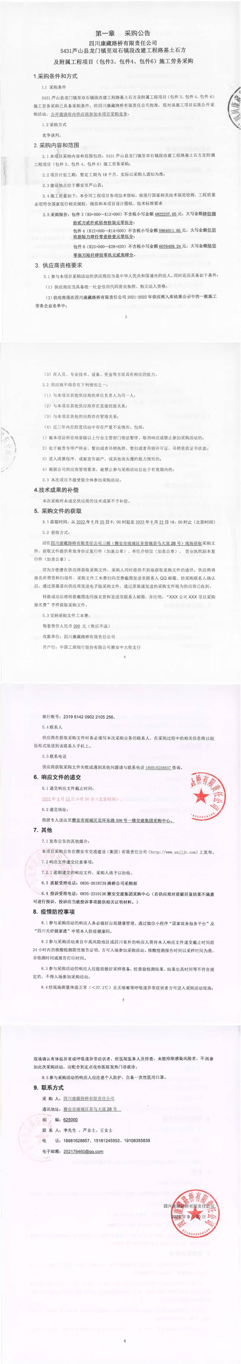 四川康藏路橋有限責(zé)任公司S431蘆山縣龍門鎮(zhèn)至雙石鎮(zhèn)段改建工程路基土石方及附屬工程項目(包件3、包件4、包件6)施工勞務(wù)采購公告