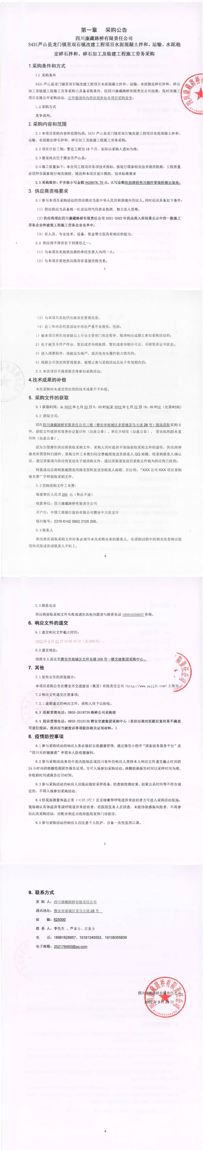 四川康藏路橋有限責(zé)任公司S431蘆山縣龍門鎮(zhèn)至雙石鎮(zhèn)改建工程項(xiàng)目水泥混凝土拌和、運(yùn)輸、水泥穩(wěn)定碎石拌和、碎石加工及臨建工程施工勞務(wù)采購(gòu)公告