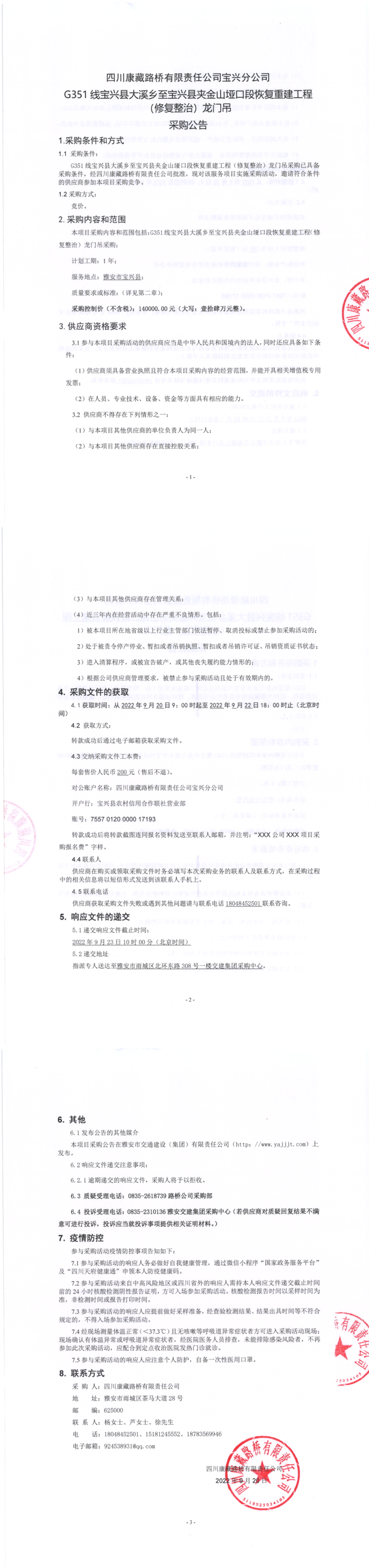 四川康藏路橋有限責任公司寶興分公司G351大溪鄉(xiāng)至寶興縣夾金山埡口段恢復重建工程(修復整治)龍門吊采購公告