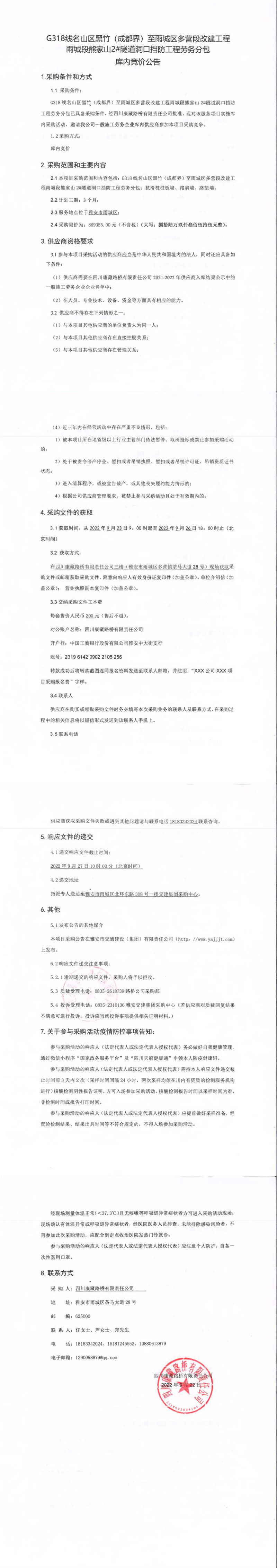 四川康藏路橋有限責(zé)任公司G318線名山區(qū)黑竹(成都界)至雨城區(qū)多營段改建工程雨城段熊家山2#隧道洞口擋防工程勞務(wù)分包庫內(nèi)競價(jià)公告