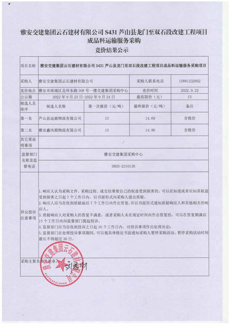 雅安交建集團云石建材有限公司S431蘆山縣龍門至雙石段改建工程項目成品料運輸服務采購競價結果公示