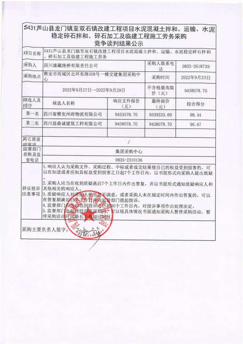 四川康藏路橋有限責(zé)任公司S431蘆山縣龍門鎮(zhèn)至雙石鎮(zhèn)改建工程項(xiàng)目水泥混凝土拌和、運(yùn)輸、水泥穩(wěn)定碎石拌和、碎石加工及臨建工程施工勞務(wù)采購(gòu)競(jìng)爭(zhēng)談判結(jié)果公示
