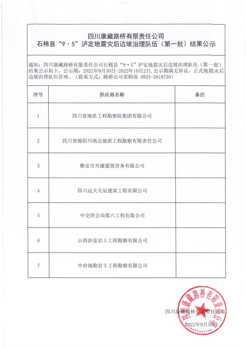 四川康藏路橋有限責(zé)任公司石棉縣“9.5”瀘定地震災(zāi)后邊坡治理隊伍(第一批)結(jié)果公示