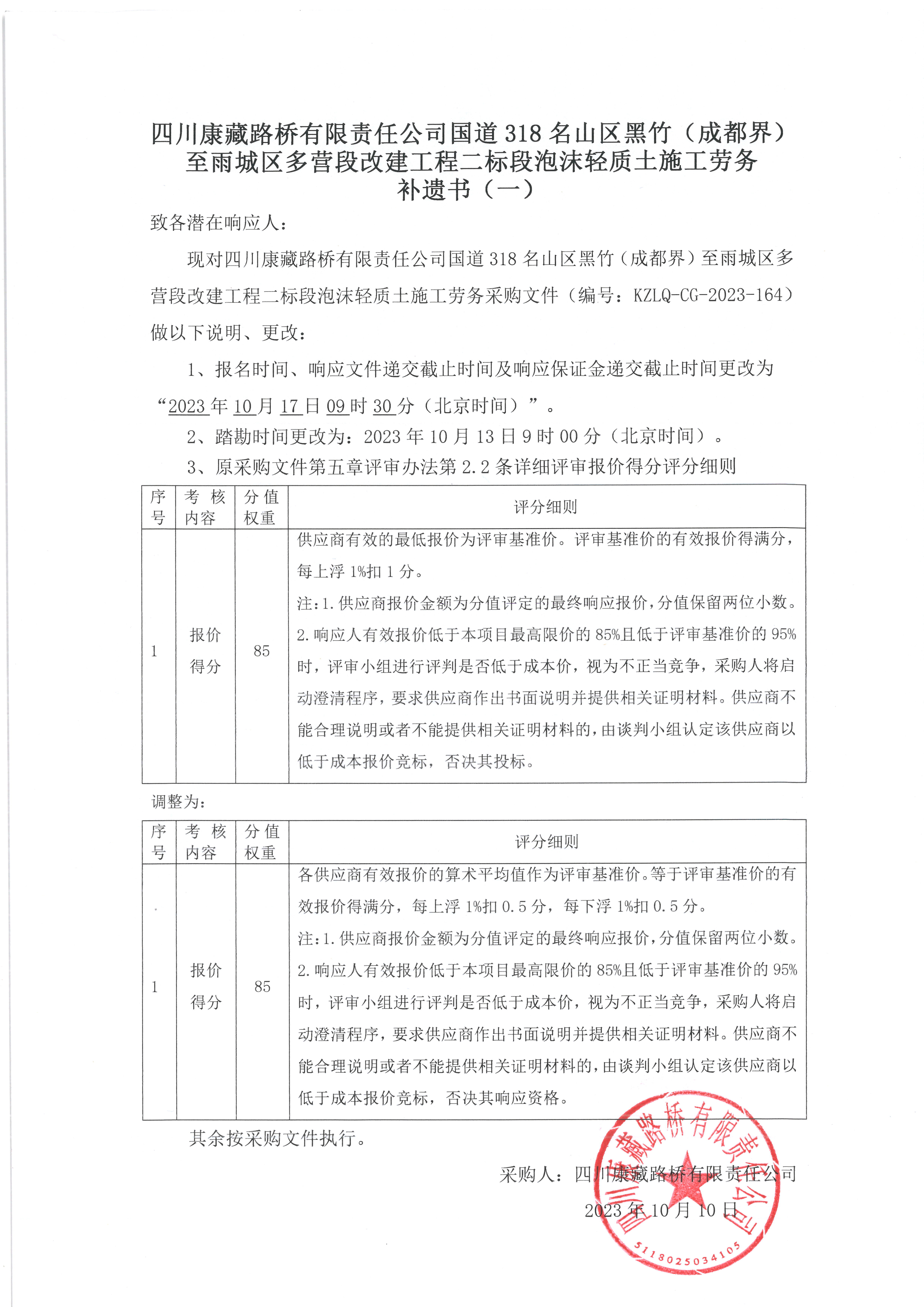 四川康藏路橋有限責(zé)任公司國(guó)道318名山區(qū)黑竹(成都界)至雨城區(qū)多營(yíng)段改建工程二標(biāo)段泡沫輕質(zhì)土施工勞務(wù)補(bǔ)遺書(一)