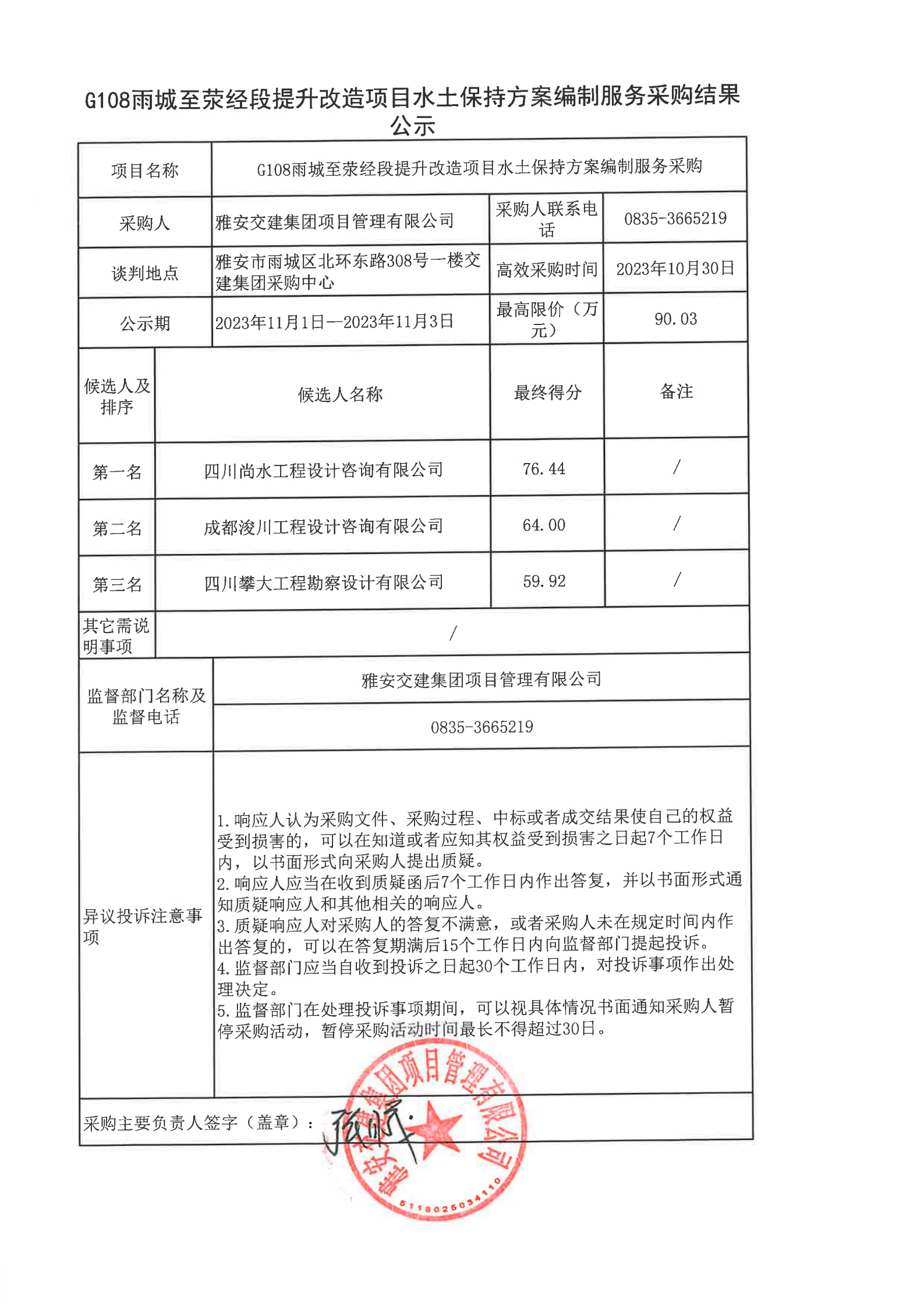 雅安交建集團(tuán)項(xiàng)目管理有限公司G108雨城至滎經(jīng)段提升改造項(xiàng)目水土保持方案編制服務(wù)采購結(jié)果公示