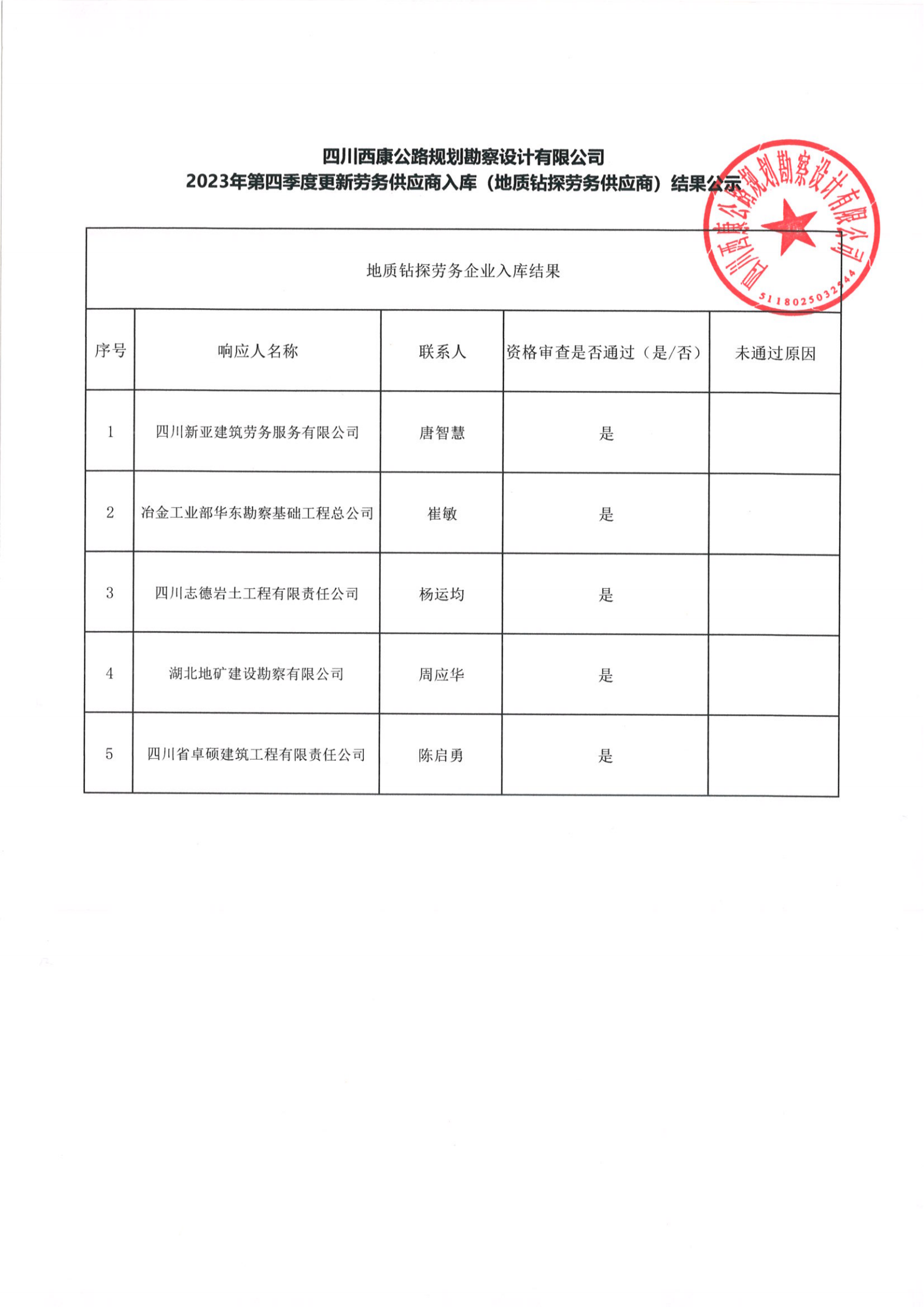 四川西康公路規(guī)劃勘察設(shè)計(jì)有限公司2023年第四季度更新勞務(wù)供應(yīng)商入庫(kù)(地質(zhì)鉆探勞務(wù)供應(yīng)商)結(jié)果公示