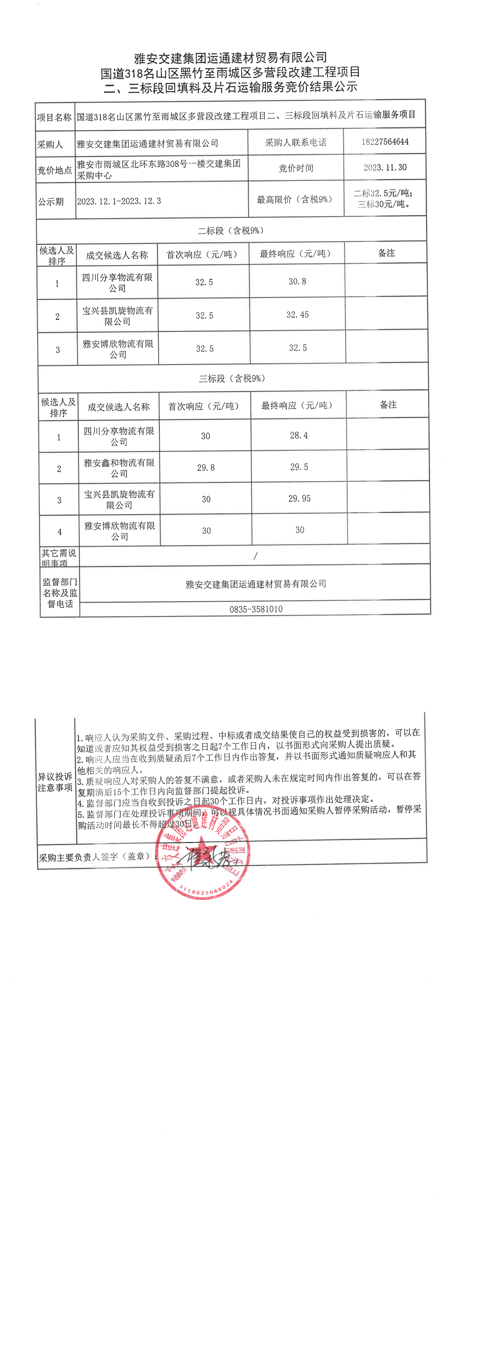 雅安交建集團(tuán)運(yùn)通建材貿(mào)易有限公司國道318名山區(qū)黑竹至雨城區(qū)多營段改建工程項(xiàng)目二、三標(biāo)段回填料、片石運(yùn)輸服務(wù)競價(jià)結(jié)果公示