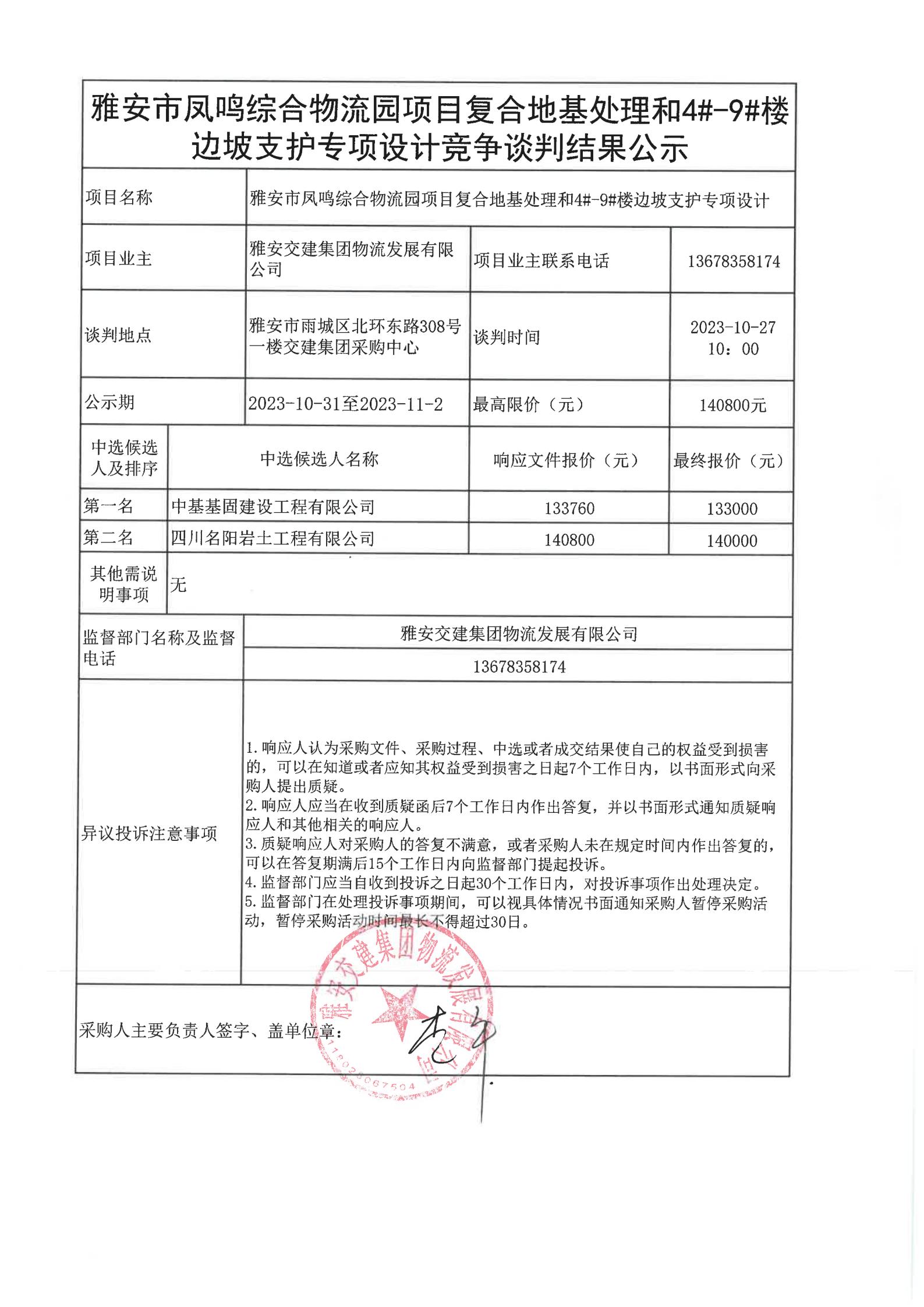 雅安交建集團物流發(fā)展有限公司雅安市鳳鳴綜合物流園項目復合地基處理和4#-9#樓邊坡支護專項設計競爭談判結(jié)果公示