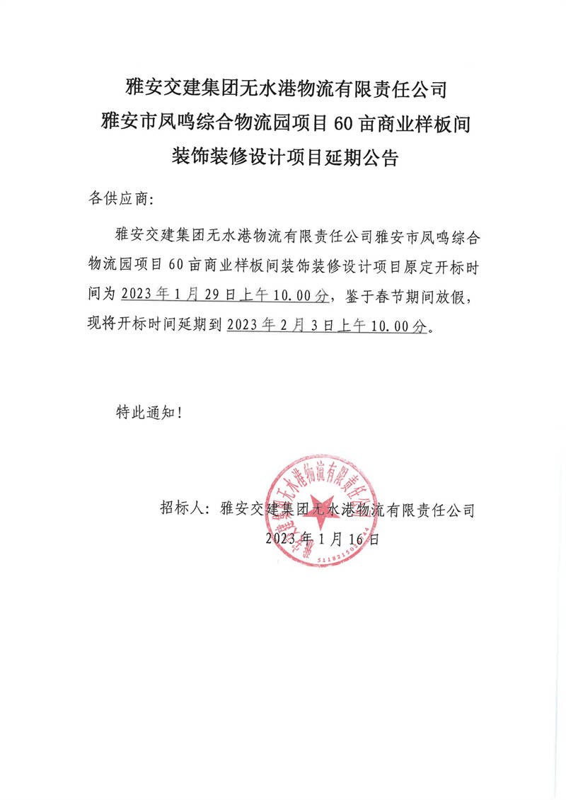 雅安交建集團(tuán)無水港物流有限責(zé)任公司雅安市鳳鳴綜合物流園項(xiàng)目60畝商業(yè)樣板間裝飾裝修設(shè)計(jì)項(xiàng)目延期公告