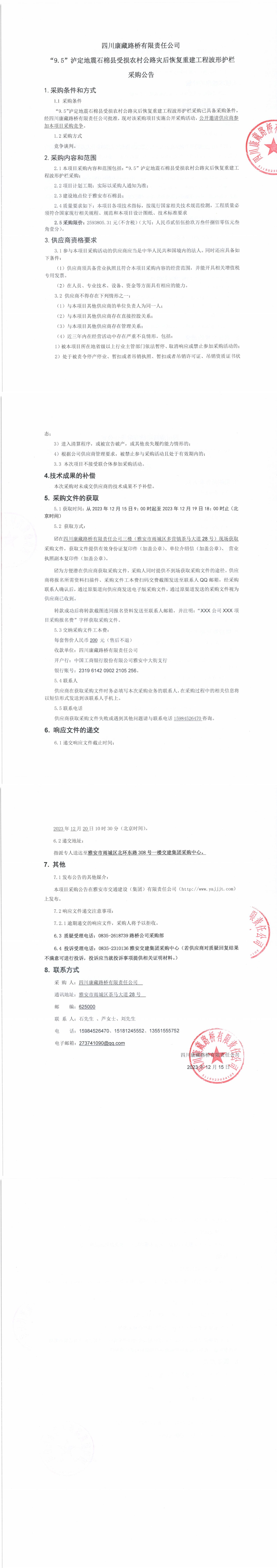 四川康藏路橋有限責任公司“9.5”瀘定地震石棉縣受損農(nóng)村公路災(zāi)后恢復(fù)重建工程波形護欄采購公告