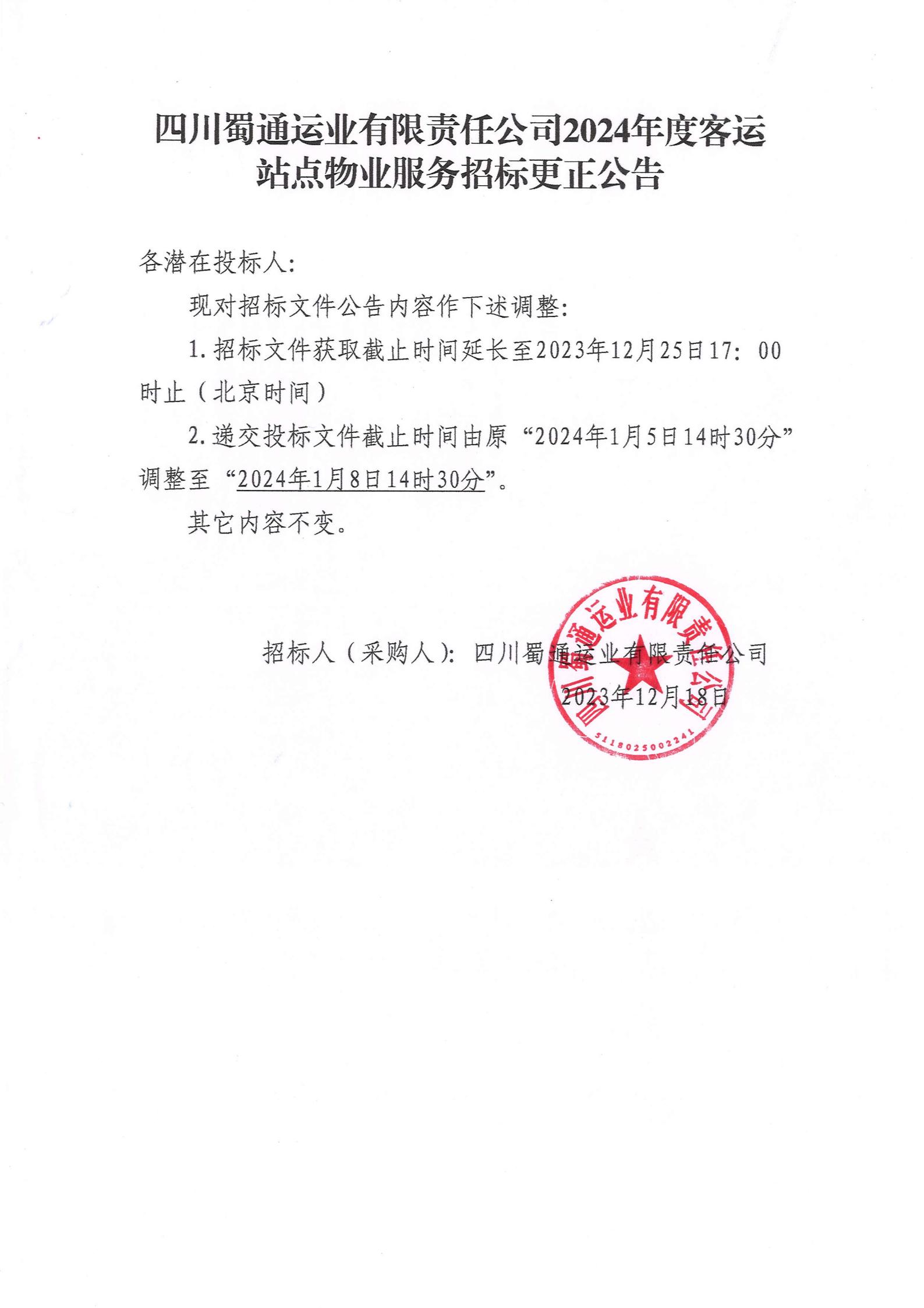 四川蜀通運業(yè)有限責任公司2024年度客運站點物業(yè)服務招標更正公告