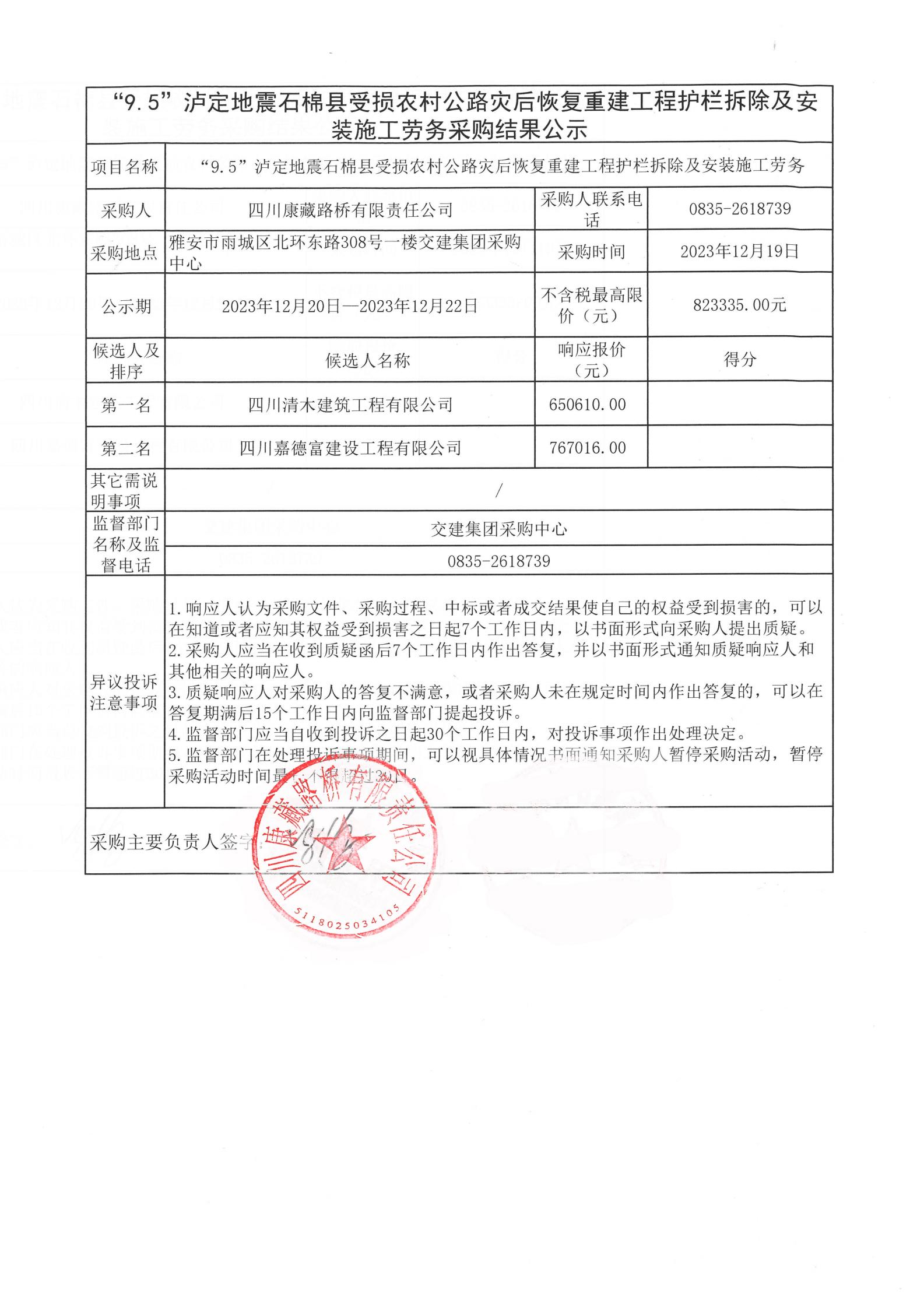 四川康藏路橋有限責任公司“9.5”瀘定地震石棉縣受損農(nóng)村公路災后恢復重建工程護欄拆除及安裝施工勞務(wù)采購結(jié)果公示