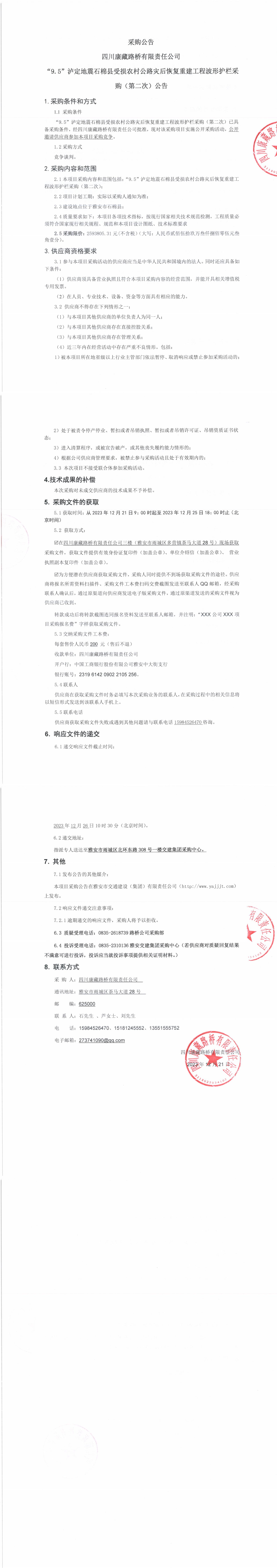 四川康藏路橋有限責(zé)任公司“9.5”瀘定地震石棉縣受損農(nóng)村公路災(zāi)后恢復(fù)重建工程波形護欄采購(第二次)公告