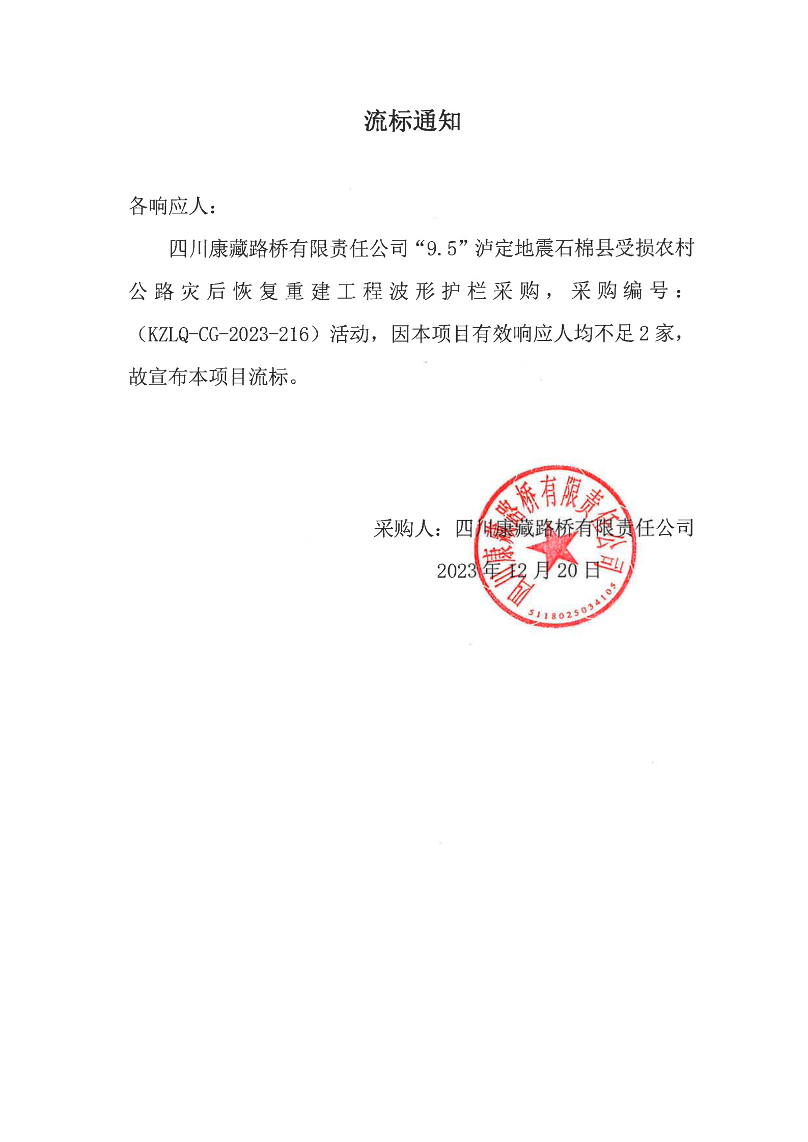 四川康藏路橋有限責任公司“9.5”瀘定地震石棉縣受損農村公路災后恢復重建工程波形護欄采購流標通知