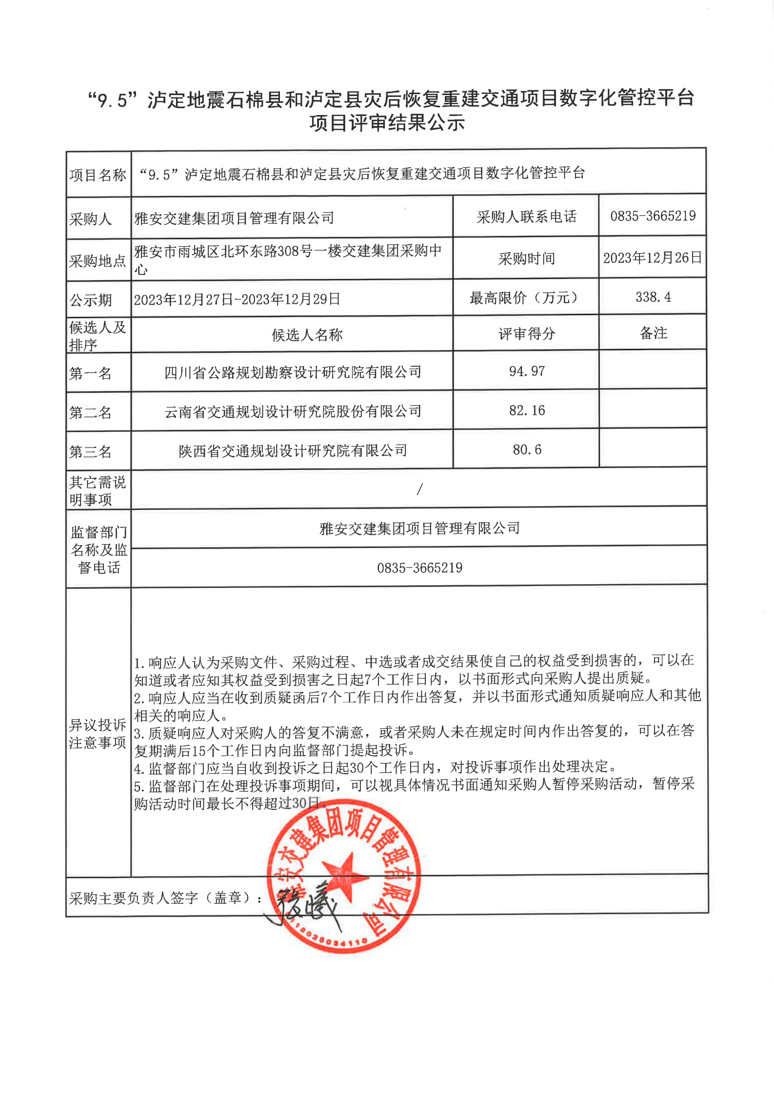 雅安交建集團項目管理有限公司“9.5”瀘定地震石棉縣和瀘定縣災后恢復重建交通項目數(shù)字化管控平臺項目評審結(jié)果公示