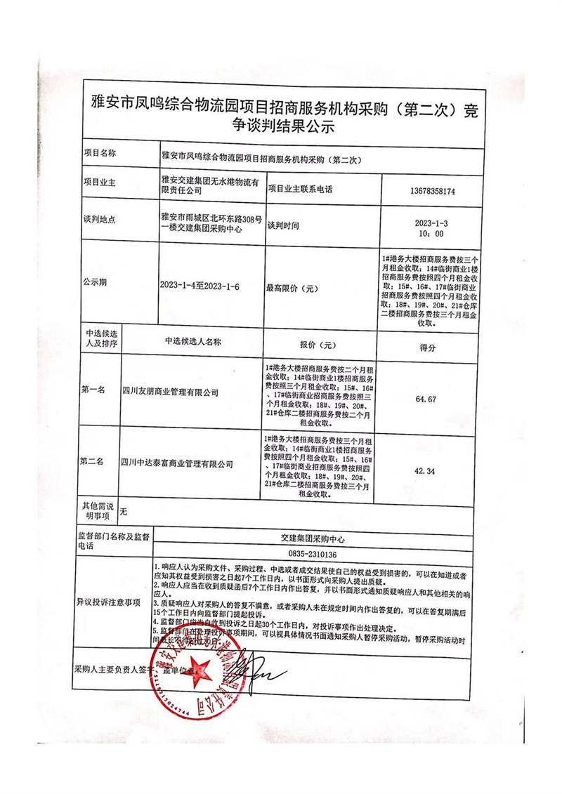 雅安交建集團(tuán)無(wú)水港物流有限責(zé)任公司雅安市鳳鳴綜合物流園項(xiàng)目招商服務(wù)機(jī)構(gòu)采購(gòu)(第二次)競(jìng)爭(zhēng)談判結(jié)果公示