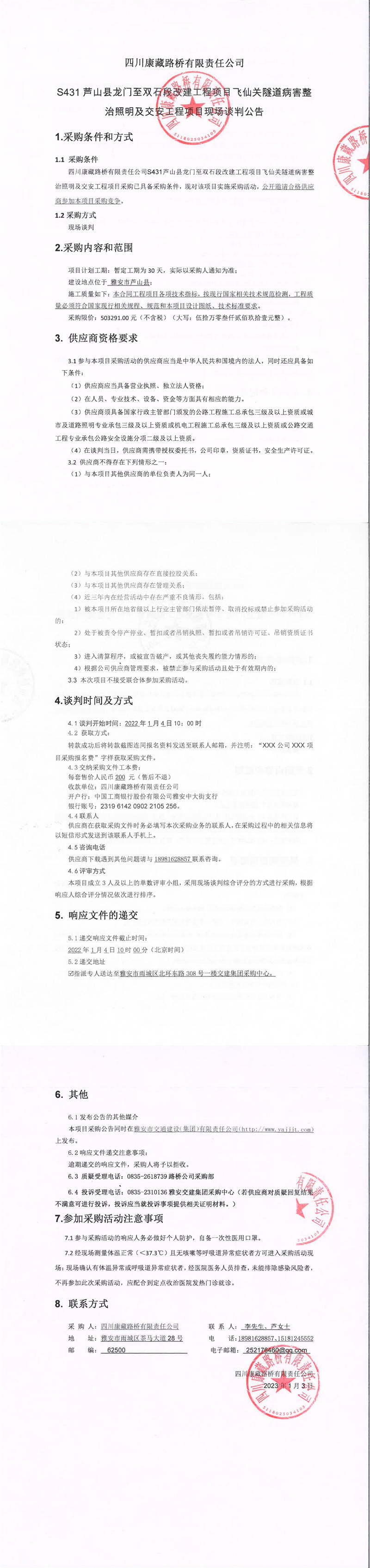四川康藏路橋有限責任公司S431蘆山縣龍門至雙石段改建工程項目飛仙關隧道病害整治照明及交安工程項目現(xiàn)場談判公告