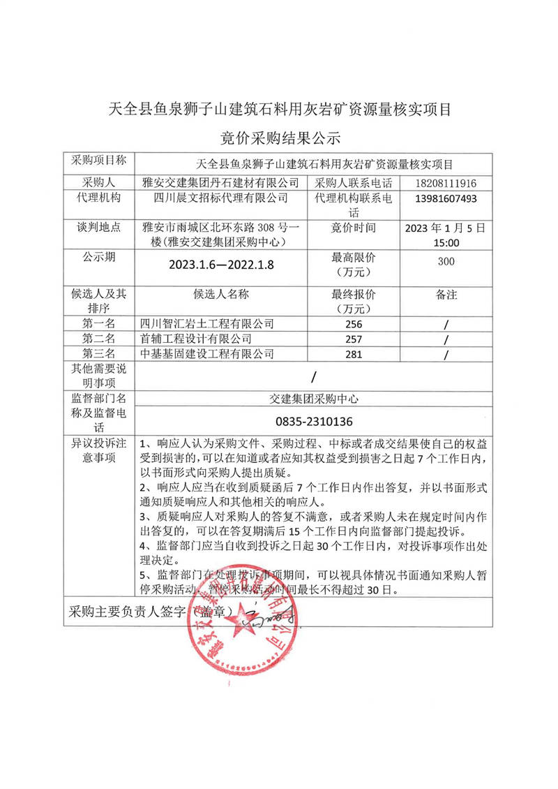 雅安交建集團(tuán)丹石建材有限公司天全縣魚泉獅子山建筑石料用灰?guī)r礦資源量核實(shí)項(xiàng)目競價(jià)采購結(jié)果公示