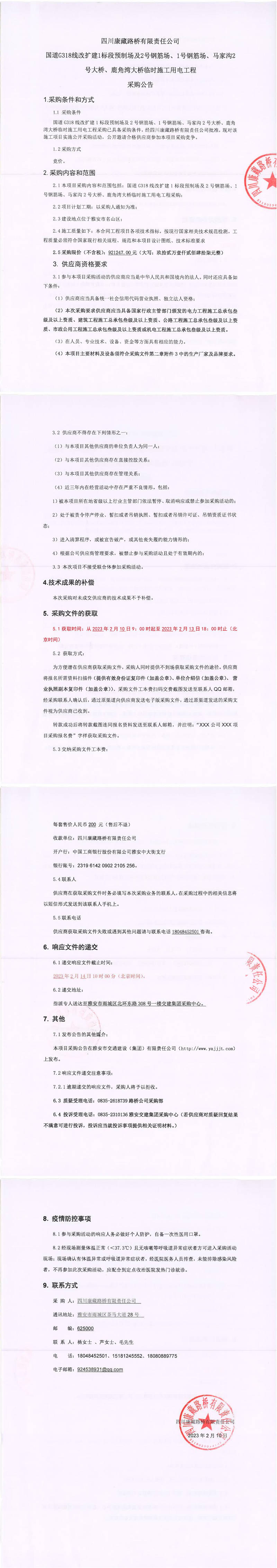 四川康藏路橋有限責任公司國道G318線改擴建1標段預制場及2號鋼筋場、1號鋼筋場、馬家溝2號大橋、鹿角灣大橋臨時施工用電工程采購公告