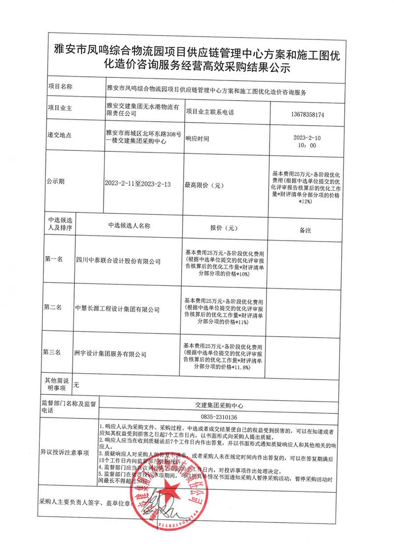 雅安交建集團(tuán)無(wú)水港物流有限責(zé)任公司雅安市鳳鳴綜合物流園項(xiàng)目供應(yīng)鏈管理中心方案和施工圖優(yōu)化造價(jià)咨詢(xún)服務(wù)經(jīng)營(yíng)高效采購(gòu)結(jié)果公示