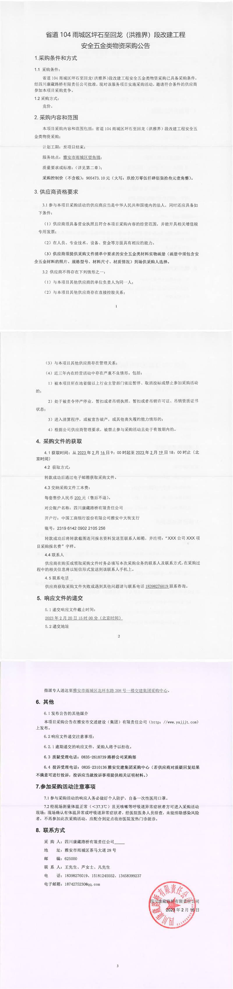 四川康藏路橋有限責(zé)任公司省道104雨城區(qū)坪石至回龍(洪雅界)段改建工程安全五金類物資采購公告