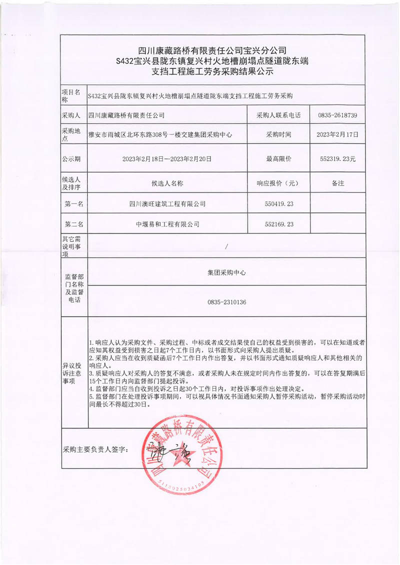 四川康藏路橋有限責任公司寶興分公司S432寶興縣隴東鎮(zhèn)復(fù)興村火地槽崩塌點隧道隴東端支擋工程勞務(wù)采購結(jié)果公示