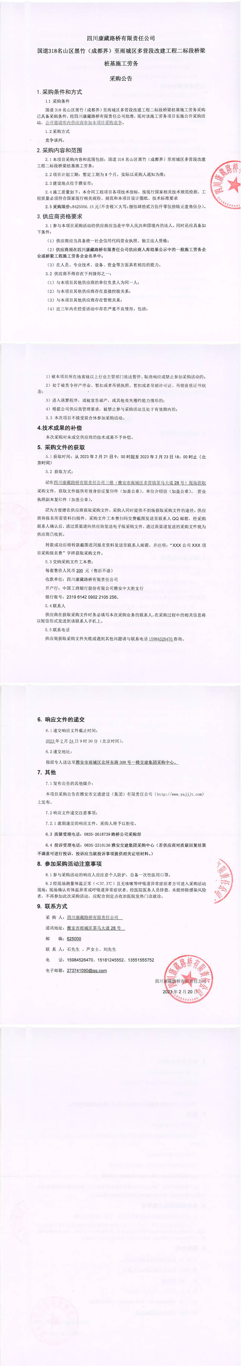 四川康藏路橋有限責(zé)任公司國道318名山區(qū)黑竹(成都界)至雨城區(qū)多營段改建工程二標(biāo)段橋梁樁基施工勞務(wù)
