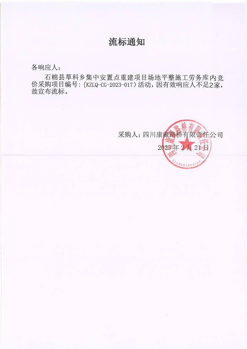 四川康藏路橋有限責(zé)任公司石棉草科鄉(xiāng)集中安置點(diǎn)重建項(xiàng)目場(chǎng)地平整施工勞務(wù)庫內(nèi)施工勞務(wù)庫內(nèi)采購流標(biāo)通知