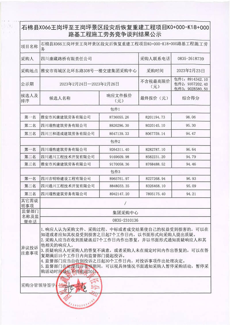 四川康藏路橋有限責(zé)任公司石棉縣X066王崗坪至王崗坪景區(qū)段災(zāi)后恢復(fù)重建工程項(xiàng)目土石方工程、排水工程、邊坡治理工程、防護(hù)工程施工勞務(wù)采購項(xiàng)目競爭談判結(jié)果公示