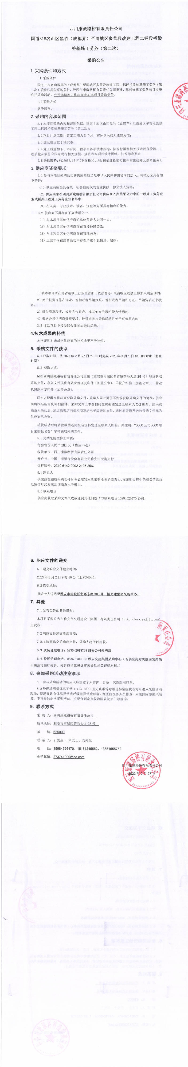 四川康藏路橋有限責(zé)任公司國(guó)道318名山區(qū)黑竹(成都界)至雨城區(qū)多營(yíng)段改建工程二標(biāo)段橋梁樁基施工勞務(wù)(第二次)采購(gòu)公告