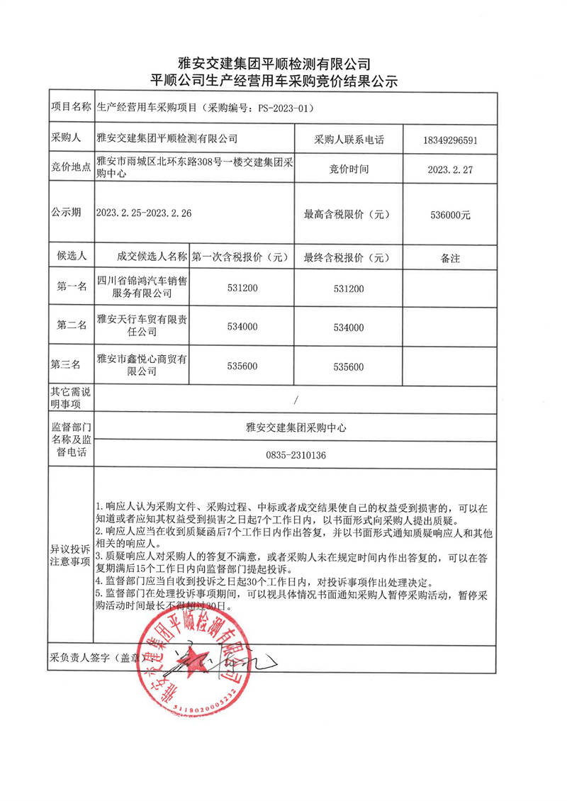 雅安交建集團(tuán)平順檢測(cè)有限公司平順公司生產(chǎn)經(jīng)營(yíng)用車采購(gòu)競(jìng)價(jià)結(jié)果公示