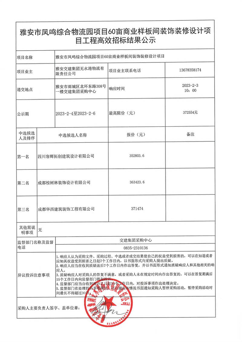 雅安交建集團(tuán)無水港物流有限責(zé)任公司雅安市鳳鳴綜合物流園項(xiàng)目60畝商業(yè)樣板間裝飾裝修設(shè)計(jì)項(xiàng)目工程高效采購(gòu)結(jié)果公示