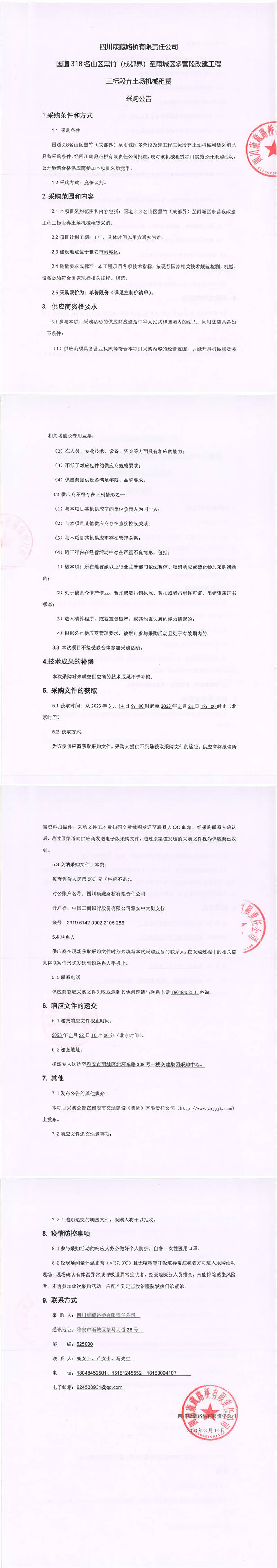四川康藏路橋有限責(zé)任公司國道318名山區(qū)黑竹(成都界)至雨城區(qū)多營段改建工程三標(biāo)段棄土場(chǎng)機(jī)械租賃采購公告
