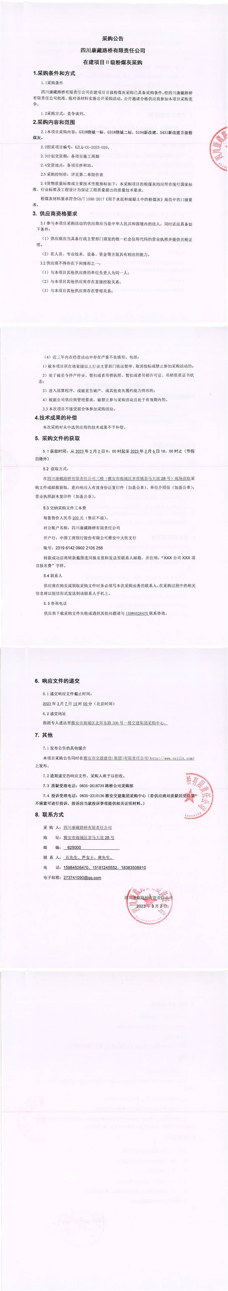 四川康藏路橋有限責任公司在建項目Ⅱ級粉煤灰采購公告