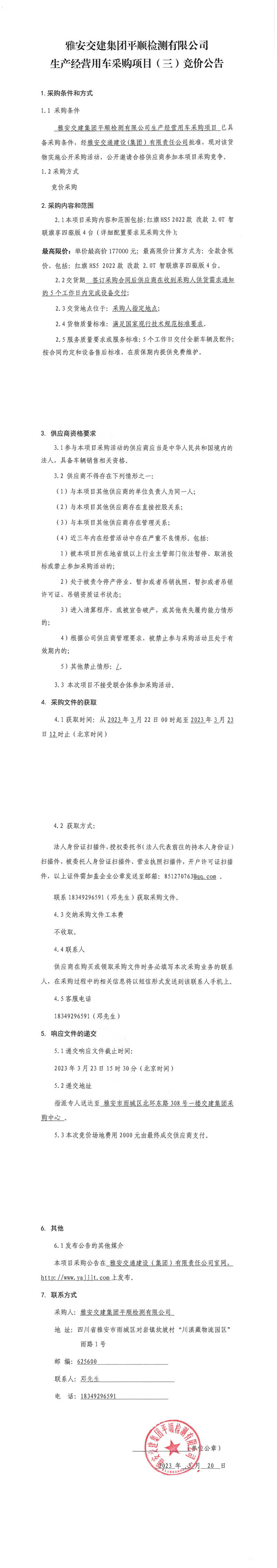 雅安交建集團(tuán)平順檢測(cè)有限公司平順公司生產(chǎn)經(jīng)營(yíng)用車采購(gòu)項(xiàng)目(三)競(jìng)價(jià)公告