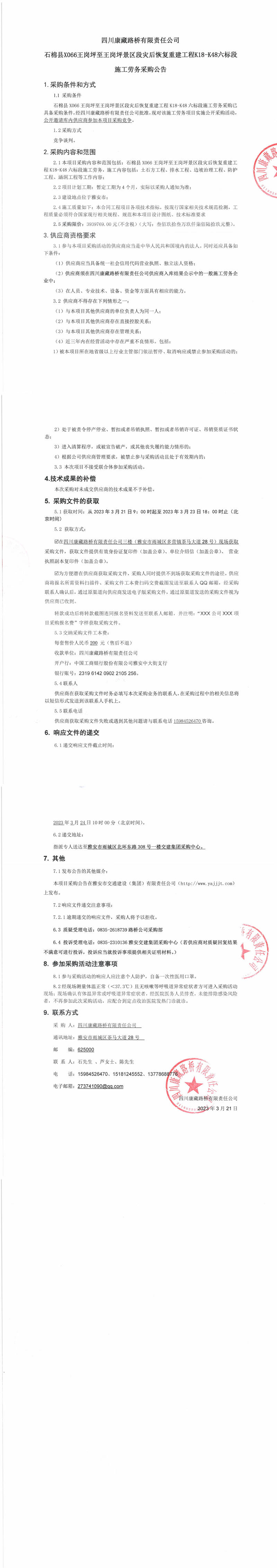 四川康藏路橋有限責任公司石棉縣X066王崗坪至王崗坪景區(qū)段災(zāi)后恢復重建工程K18-K48六標段施工勞務(wù)采購公告