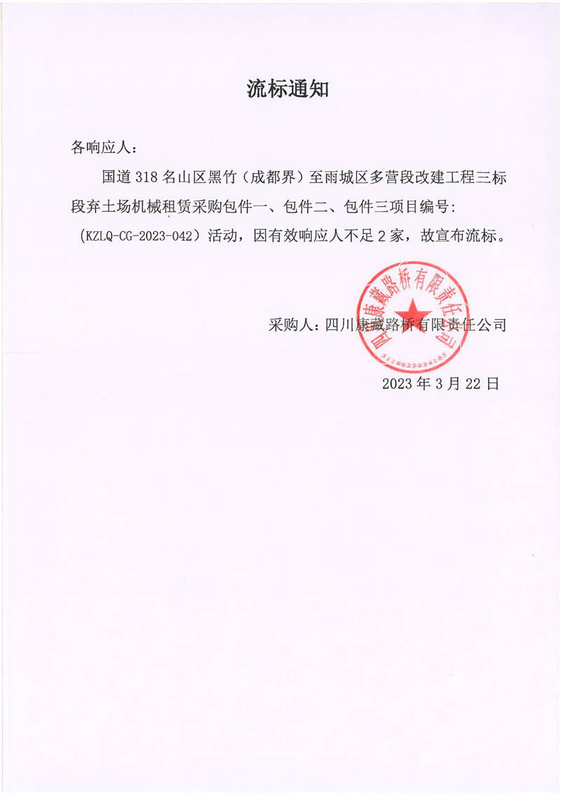 四川康藏路橋有限責(zé)任公司國(guó)道318名山區(qū)黑竹(成都界)至雨城區(qū)多營(yíng)段改建工程三標(biāo)段棄土場(chǎng)機(jī)械租賃采購(gòu)流標(biāo)通知