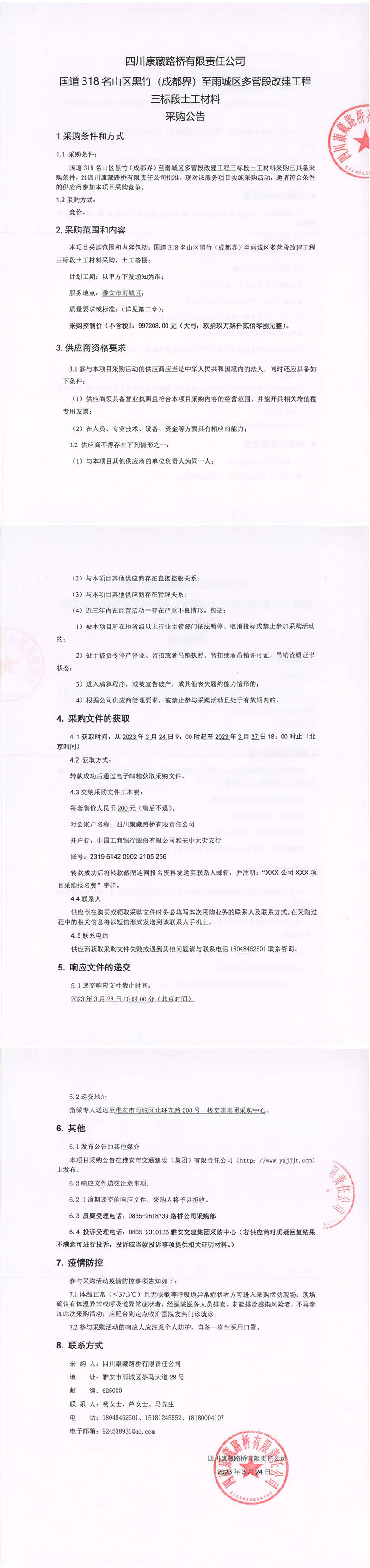 四川康藏路橋有限責(zé)任公司國道318名山區(qū)黑竹(成都界)至雨城區(qū)多營段改建工程三標(biāo)段土工材料采購公告