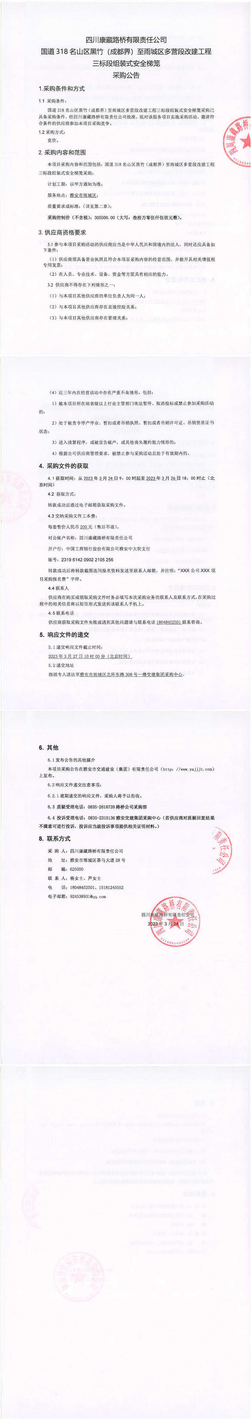 四川康藏路橋有限責(zé)任公司國道318名山區(qū)黑竹(成都界)至雨城區(qū)多營段改建工程三標段組裝式安全梯籠采購公告