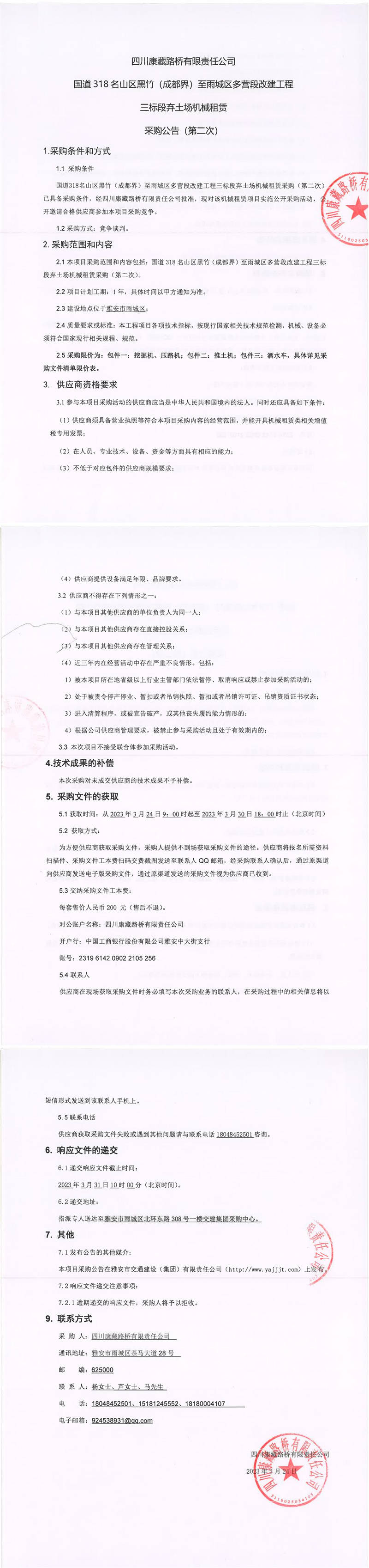 四川康藏路橋有限責任公司國道318名山區(qū)黑竹(成都界)至雨城區(qū)多營段改建工程三標段棄土場機械租賃采購公告(第二次)