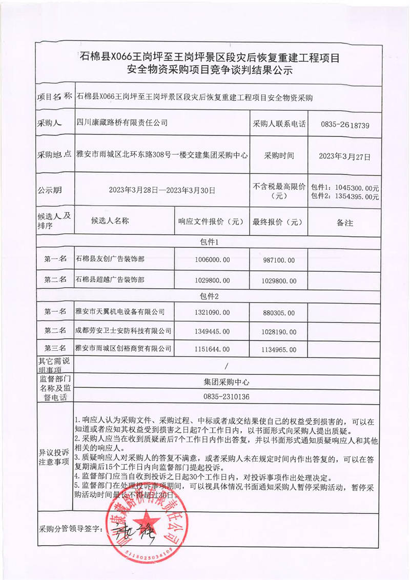 四川康藏路橋有限責任公司石棉縣X066王崗坪至王崗坪景區(qū)段災后恢復重建工程項目安全物資采購項目競爭談判結(jié)果公示