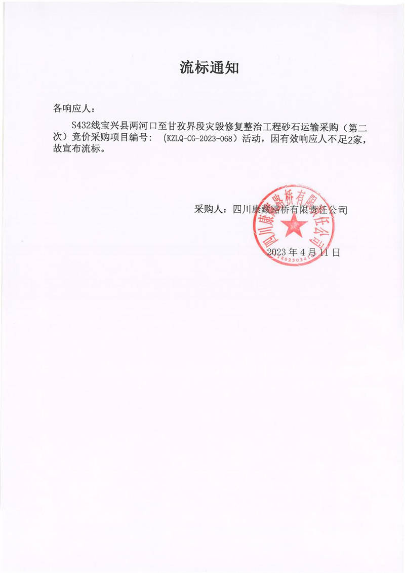 四川康藏路橋有限責(zé)任公司寶興分公司S432寶興縣兩河口至甘孜界段災(zāi)毀修復(fù)整治工程砂石運(yùn)輸采購(gòu)(第二次)流標(biāo)通知
