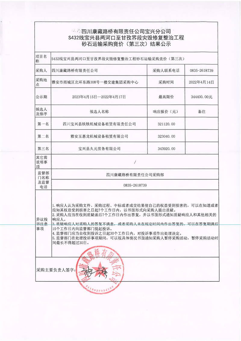 四川康藏路橋有限責(zé)任公司寶興分公司S432線寶興縣兩河口至甘孜界段災(zāi)毀修復(fù)整治工程砂石運輸采購競價(第三次)結(jié)果公示