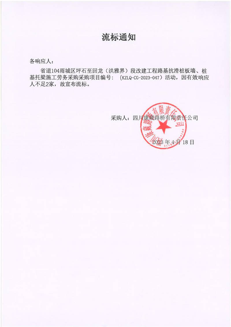 四川康藏路橋有限責任公司省道104雨城區(qū)坪石至回龍(洪雅界)段改建工程路基抗滑樁板墻、樁基托梁施工勞務流標通知