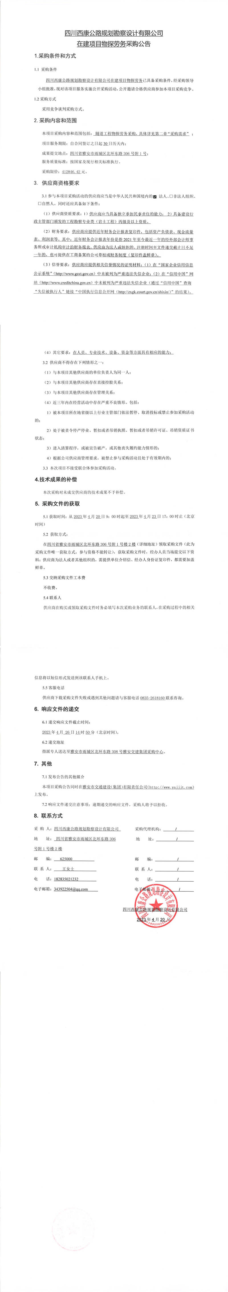 四川西康公路規(guī)劃勘察設(shè)計(jì)有限公司在建項(xiàng)目物探勞務(wù)采購公告