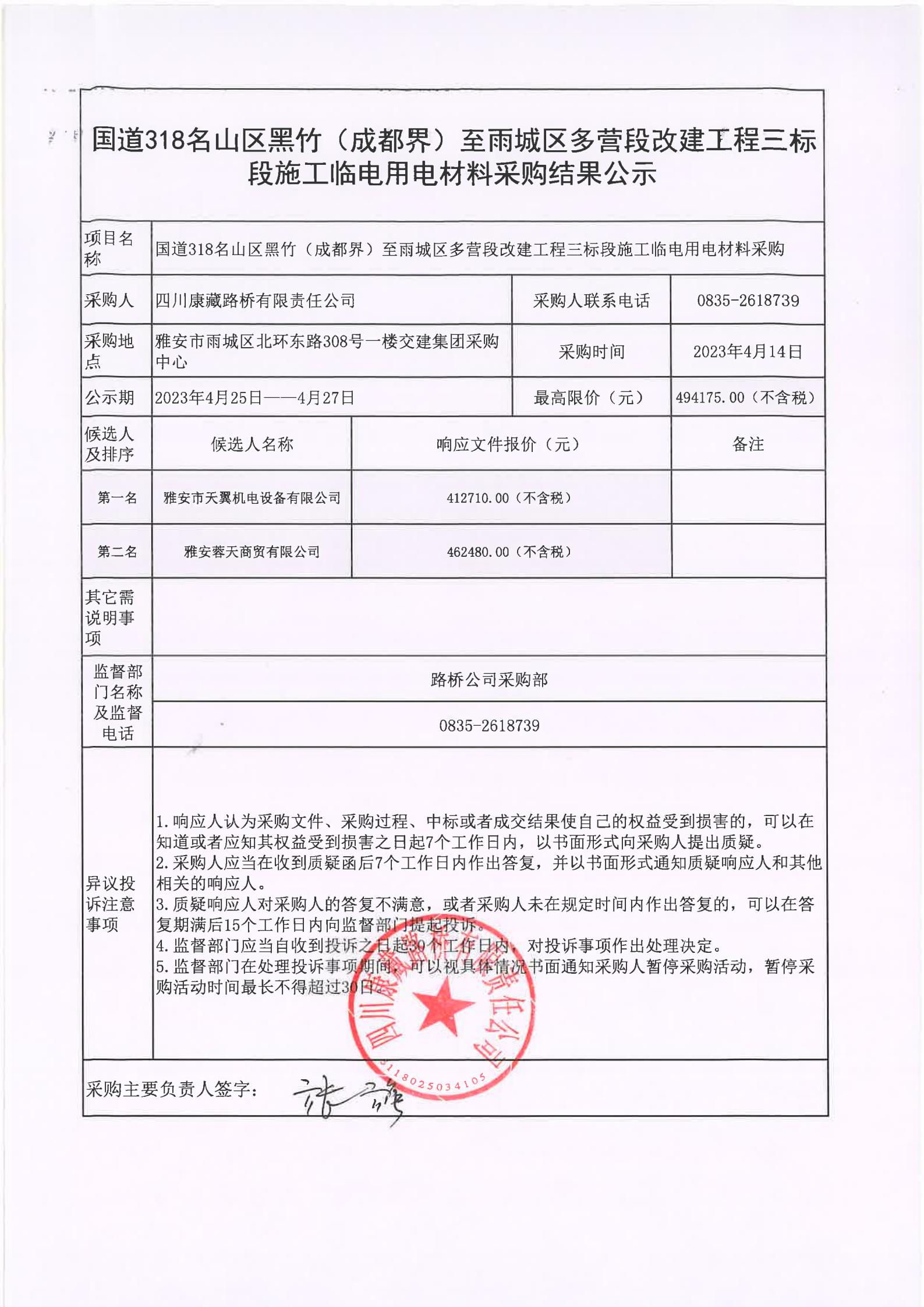 四川康藏路橋有限責(zé)任公司國道318名山區(qū)黑竹(成都界)至雨城區(qū)多營段改建工程三標(biāo)段施工臨電用電材料采購結(jié)果公示
