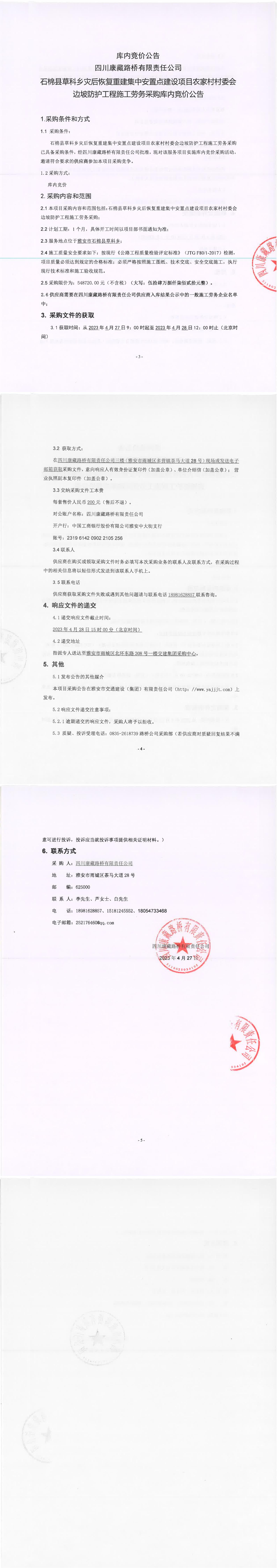 四川康藏路橋有限責(zé)任公司石棉草科鄉(xiāng)災(zāi)后恢復(fù)重建集中安置點(diǎn)建設(shè)項(xiàng)目農(nóng)家村村委會(huì)邊坡防護(hù)工程施工勞務(wù)采購(gòu)采購(gòu)庫內(nèi)競(jìng)價(jià)公告