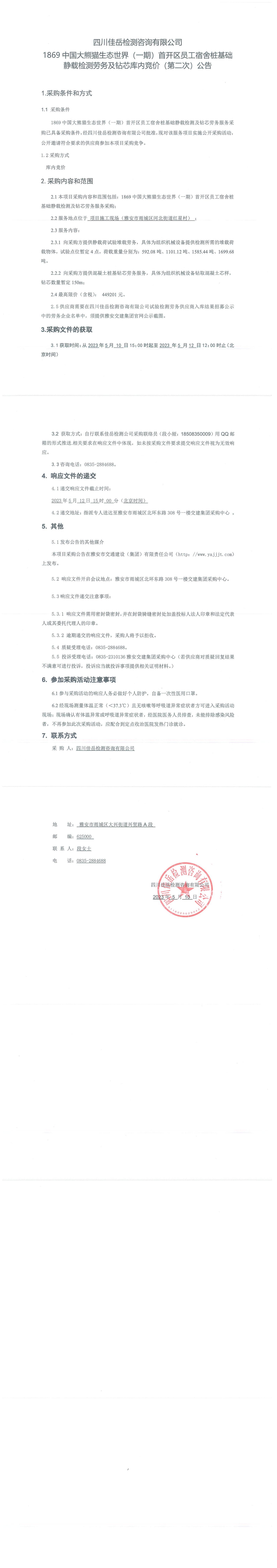 四川佳岳檢測咨詢有限公司1869中國大熊貓生態(tài)世界(一期)首開區(qū)員工宿舍樁基礎(chǔ)靜載檢測勞務(wù)及磚芯庫內(nèi)競價(jià)(第二次)采購公告