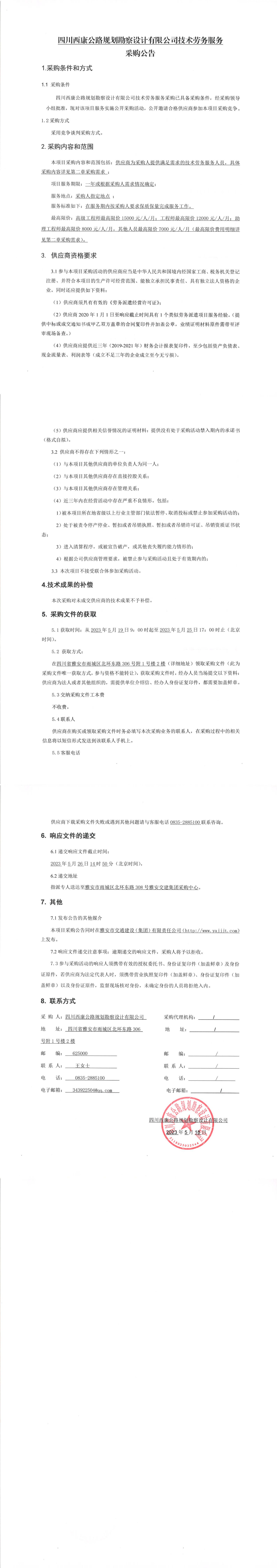 四川西康公路規(guī)劃勘察設(shè)計有限公司技術(shù)勞務(wù)服務(wù)采購公告