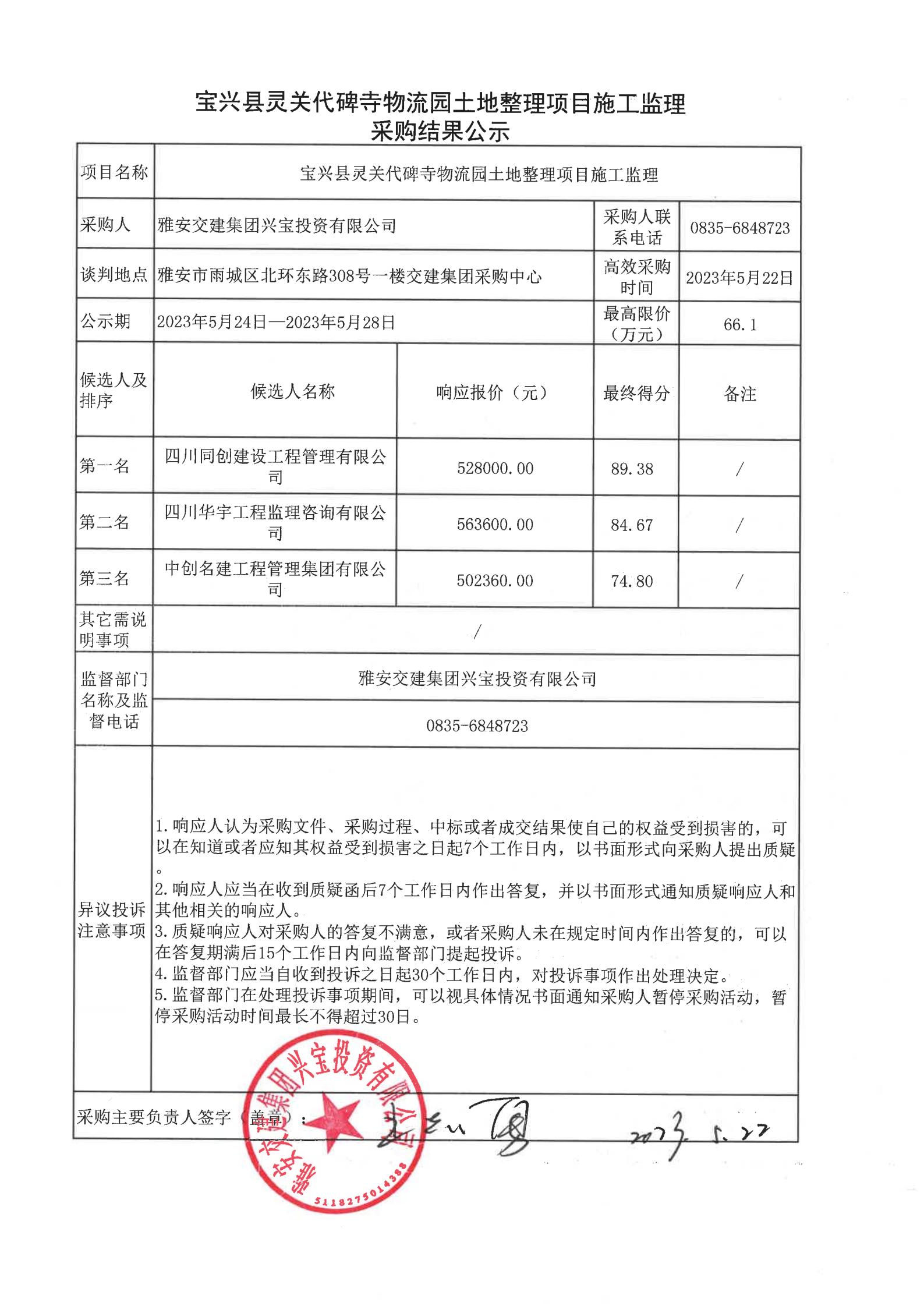 雅安交建集團(tuán)興寶投資有限公司寶興縣靈關(guān)代碑寺物流園土地整理項目施工監(jiān)理采購結(jié)果公示
